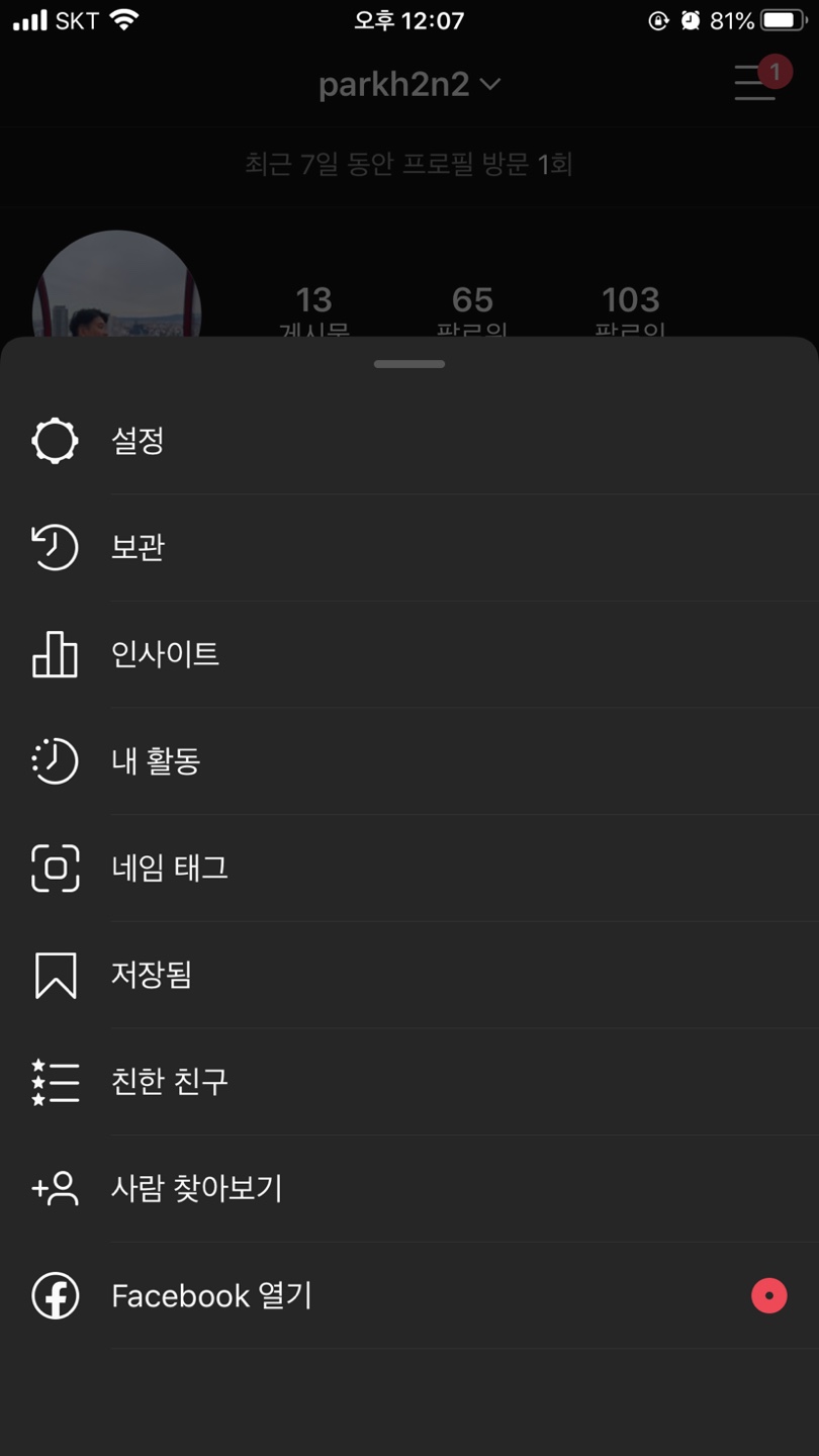 인스타그램 계정 화면 계정에 들어갔으면 오른쪽 위쪽에 버튼을 눌러서 설정 페이지를 눌러줍니다.