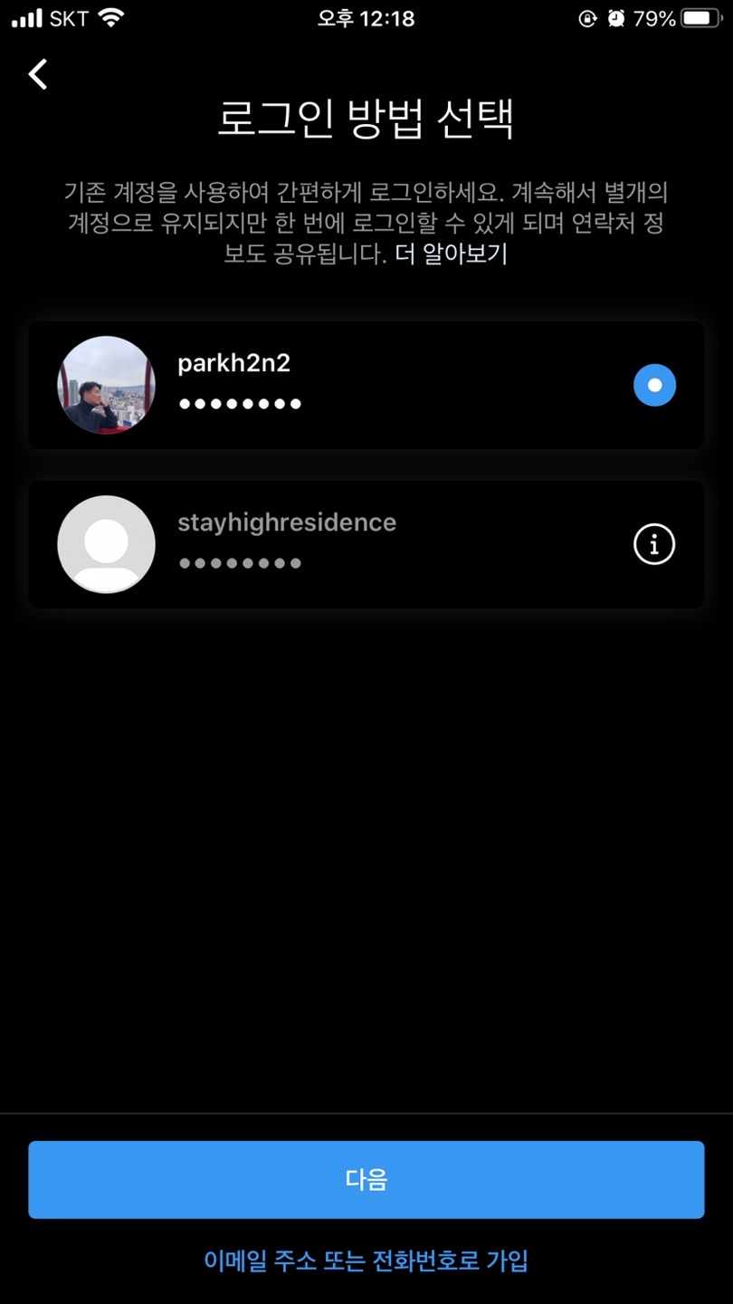 나머지 계정을 설정하면 되고 아이디 계정을 변경하려면 위에 있는 이름을 클릭하면 기존에 있는 계정으로 변경이 가능합니다. 모두 인스타 계정 여러 가지 나눠서 편하게 사용하세요.