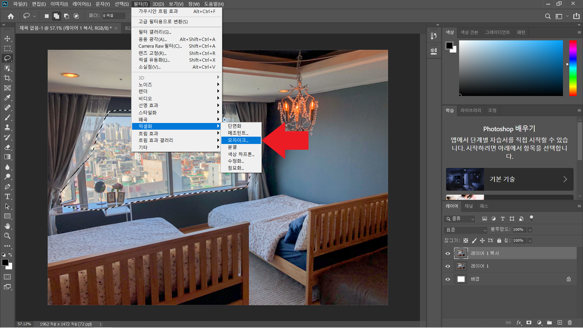 나머지 방법은 똑같은데 [필터-픽셀화-모자이크] 이쪽을 눌러주면 됩니다.