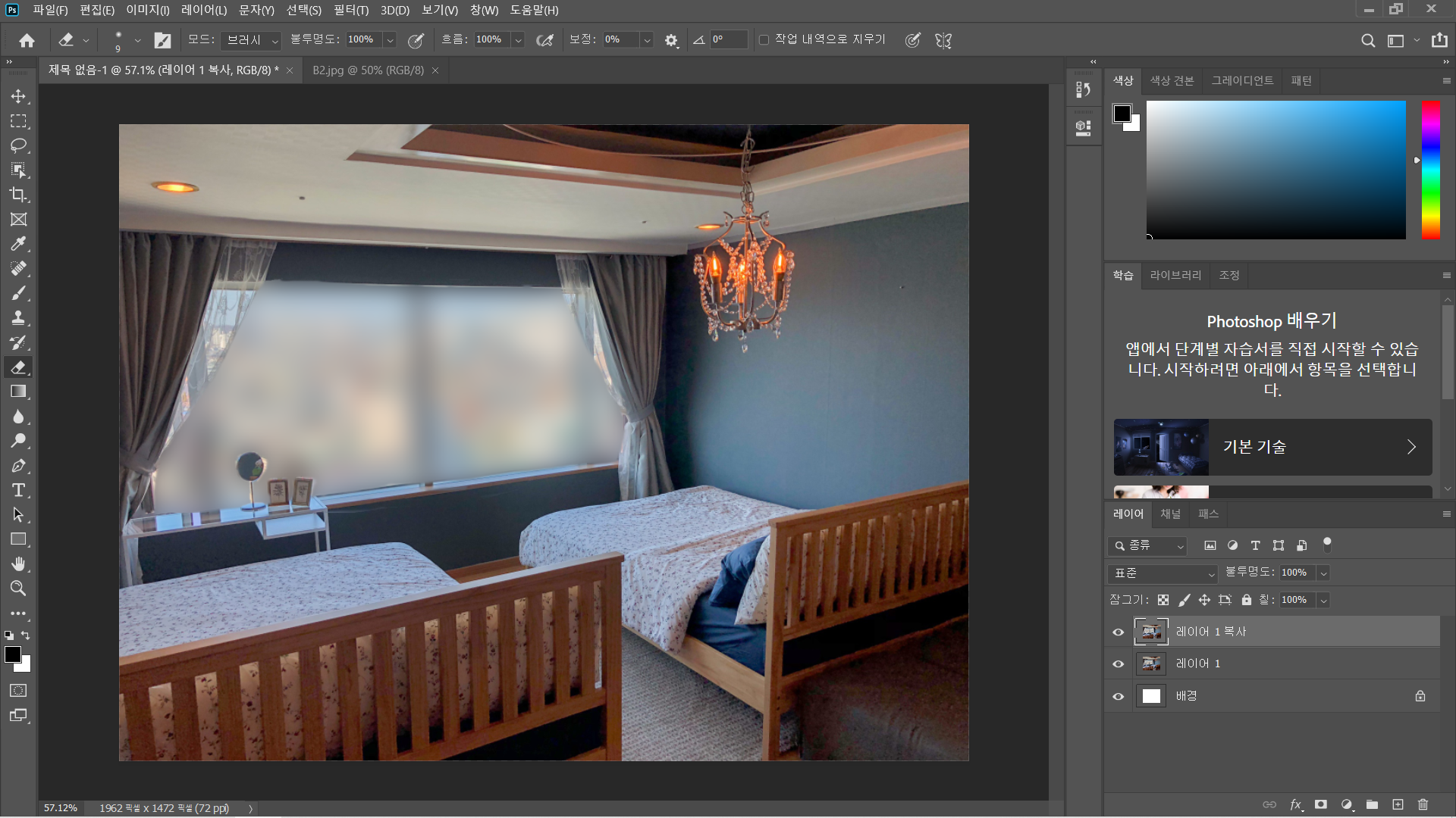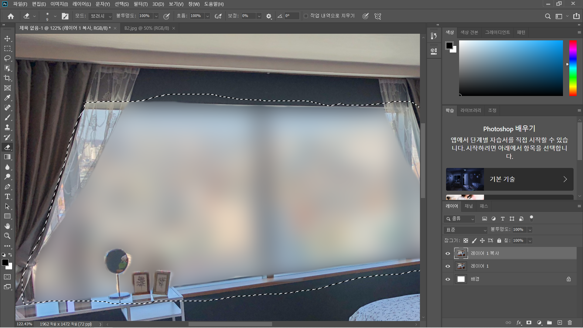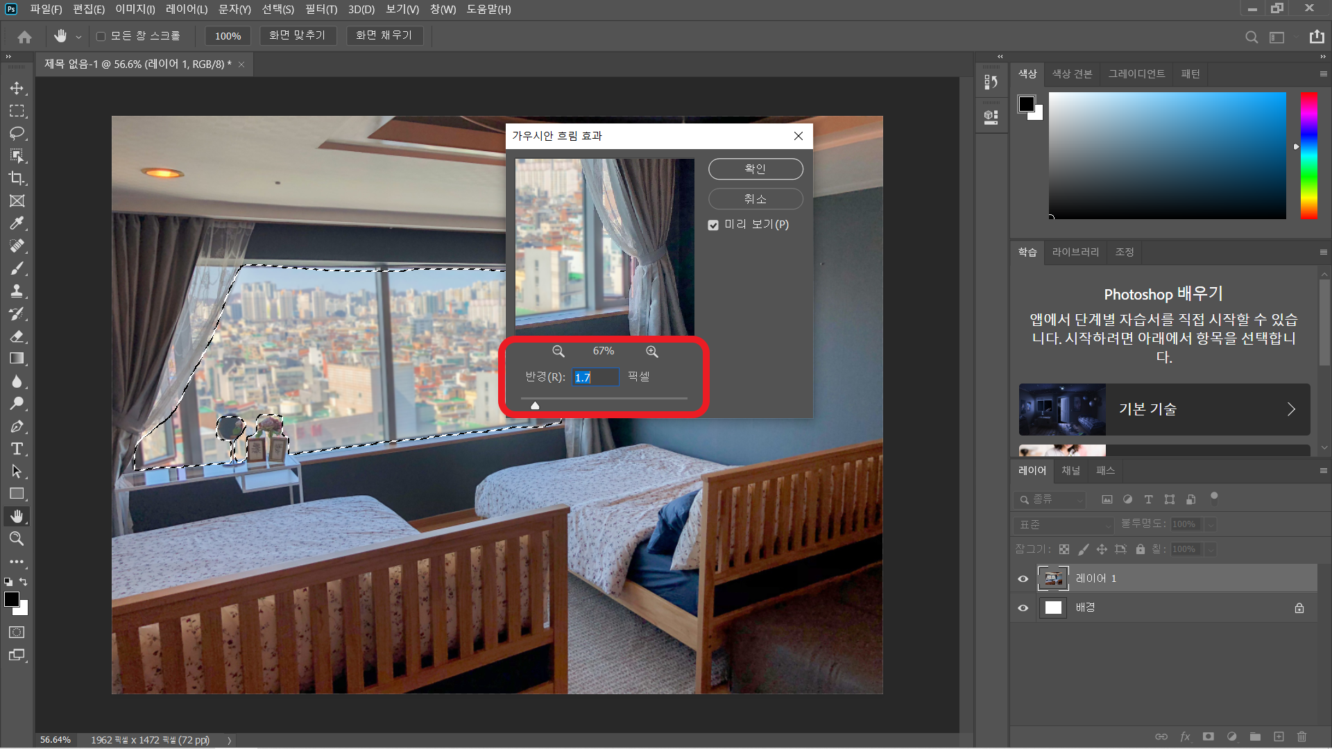 이미지를 불러왔으면 어느 부분을 블러 처리할지 정해야 합니다. 저는 창문 쪽을 블러 처리해볼게요~